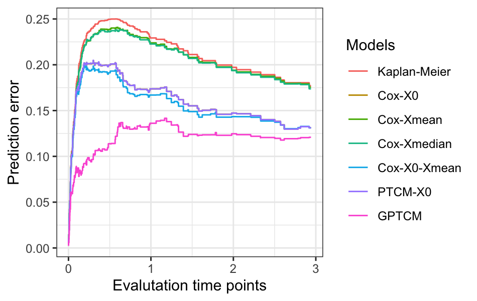 After fitting GPTCM-Ber2, we compare its the survival prediction performance with other approaches (i.e. Kaplan-Meier method without covariates, classic Cox model with two clinical covariates (Cox.clin), Cox model with mean aggregate covariates (Cox.X.mean), Cox model with median aggregate covariates (Cox.X.median), Cox model with clinical and mean aggregate covariates (Cox.clin.X.mean), and frequentist semiparametric promotion time cure model with clinical variables (PTCM.clin)). The follow figure shows the prediction performance of time-dependent Brier scores. It is clear that our GPTCM has much better survival prognosis than other approaches.