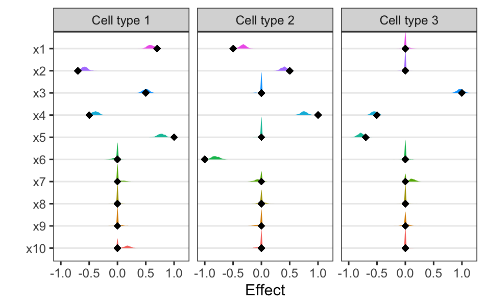 The following figure shows the posterior distributions of cell-type-specific effects associated with cell-type-specific progression with the black diamonds indicating true effects, and marginal posterior inclusion probabilities (mPIP) of Bayesian variable selection (BVS).