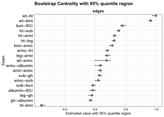 We can compute standard node centrality indices (strength, expected influence, closeness, and betweenness) together with their 95% quantile regions.