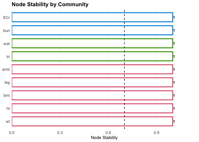 Nodes with stability < 0.70 are retained in the network but excluded from the clustering (they will appear in grey). Singletons are also excluded from communities.