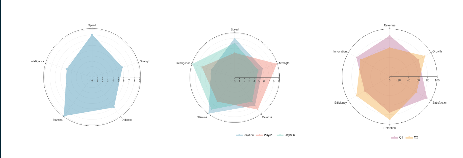 linePlot - Line plotspiePlot - Pie and donut plotsradarPlot - Radar plotsparallelCoordinatesPlot - Parallel coordinate