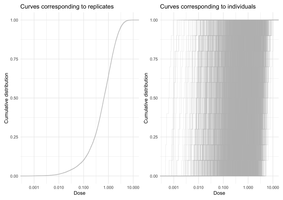 In the right panel, ECDFs are plotted for each individual, showing distributions within individuals. A wide spread within individual curves is indicative of large within-individual variation, while the spread between curves reflects between-individual variation.