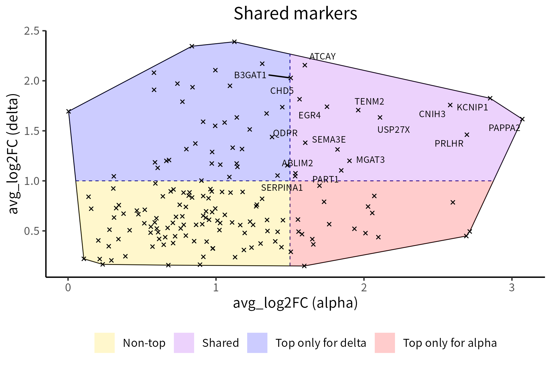 An application is visualizing shared cluster markers. Here, we display the shared markers of the alpha and delta clusters from the HBP dataset, highlighting the top ones in purple: