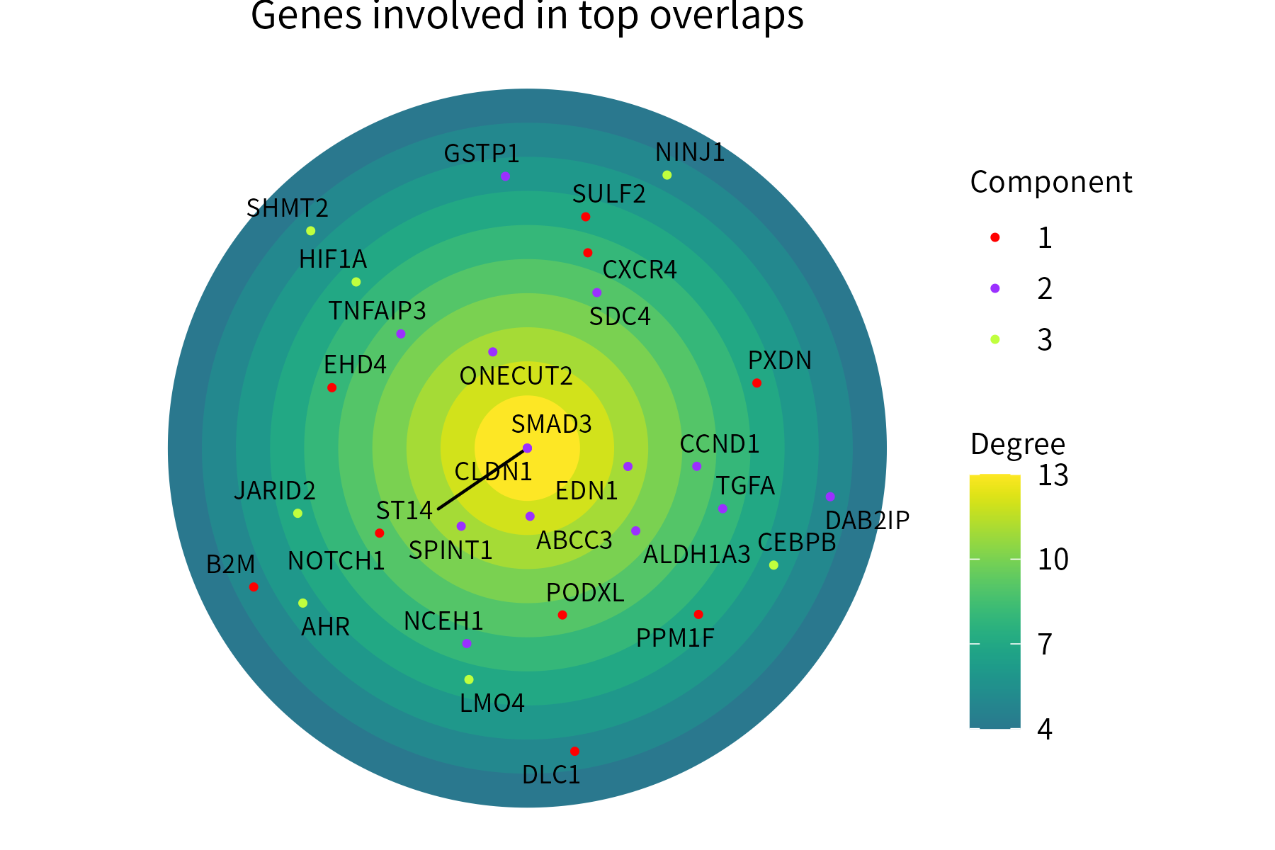It can be used to showcase genes involved in a network. Just like networkPlot, radialPlot can distinguish genes belonging to different connected components: