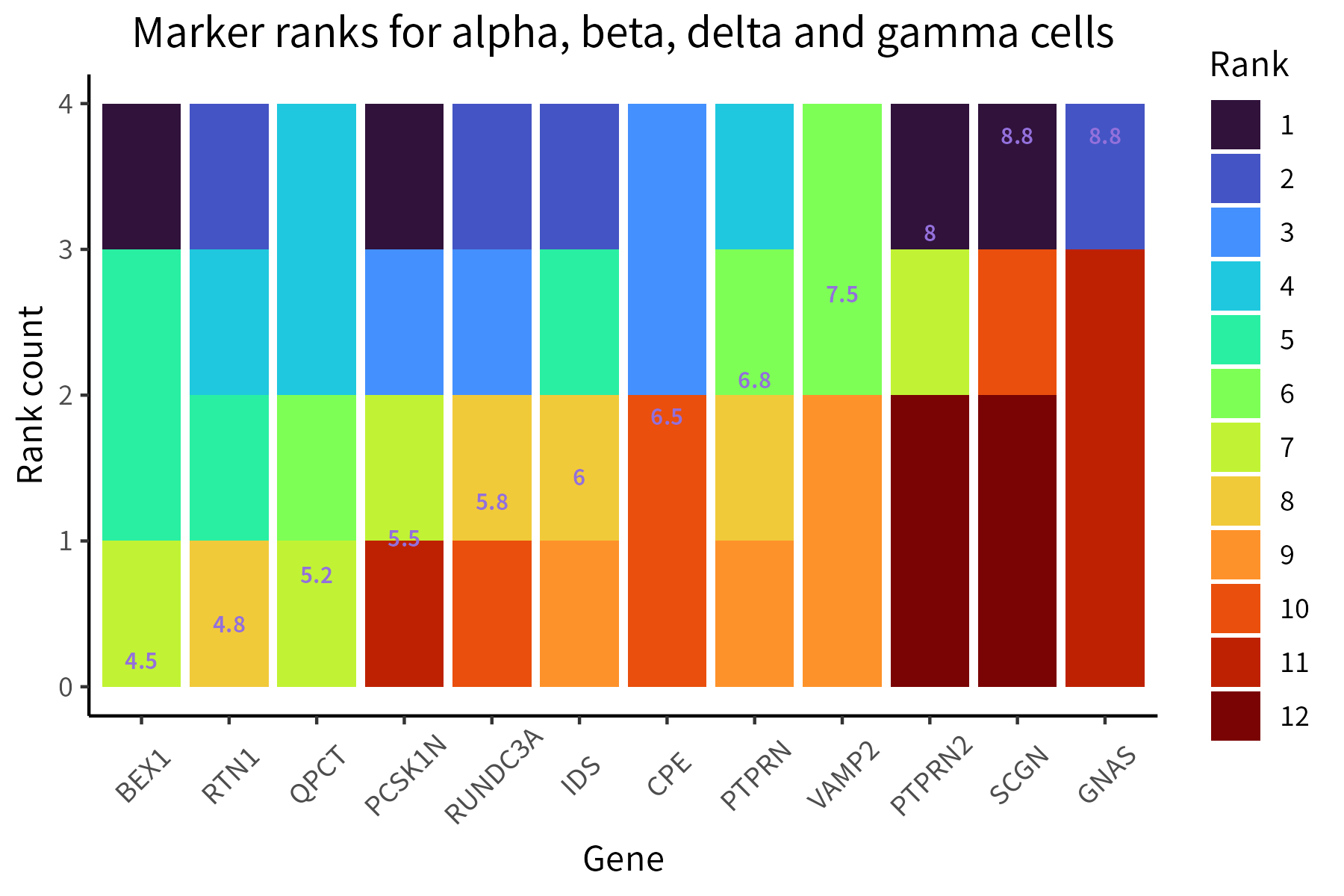 This function aggregates multiple ranks available for a group of items in a single plot. Average ranks can be displayed on the plot. Here, we visualize the ranks of 12 genes as markers of the alpha, beta, delta and gamma clusters in the HBP dataset: