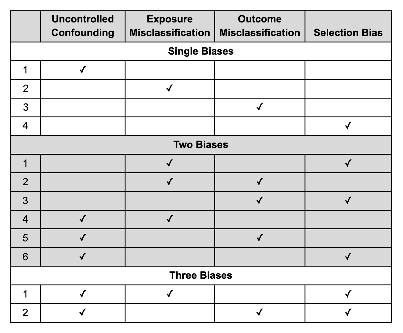The multibias package is used to adjust for multiple biases in causal inference when working with observational data. Bias here refers to the case when the associational estimate of effect does not equal the causal estimate of effect: