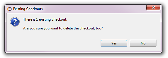 If checkouts exist for the repository connection to be deleted the following warning dialog will pop up first: