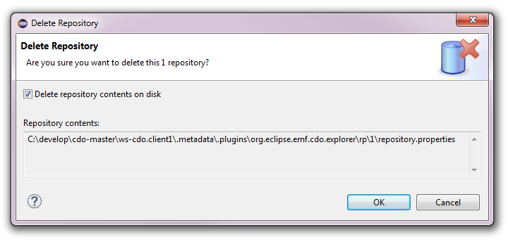 An existing repository connection can be deleted by selecting that repository connection and pressing the Del key or selecting the Delete action in the context menu. The following dialog will pop up: