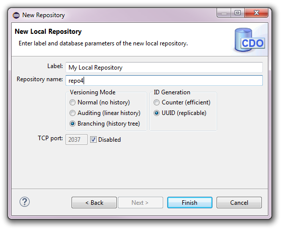 The optional TCP port field specifies on what port a ITCPAcceptor will accept incoming connection requests. By default this option is disabled because local repositories run in the same Java VM as the hosting Eclipse IDE, and are always accepting connection requests from there through an implicit IJVMAcceptor, too.