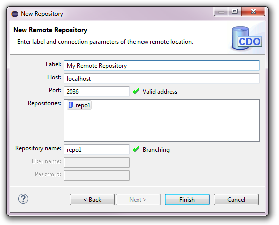 The user name and password fields are only enabled if the targeted repository supports authentication. See Managing Security on how to configure authentication and authorization in CDO repositories.